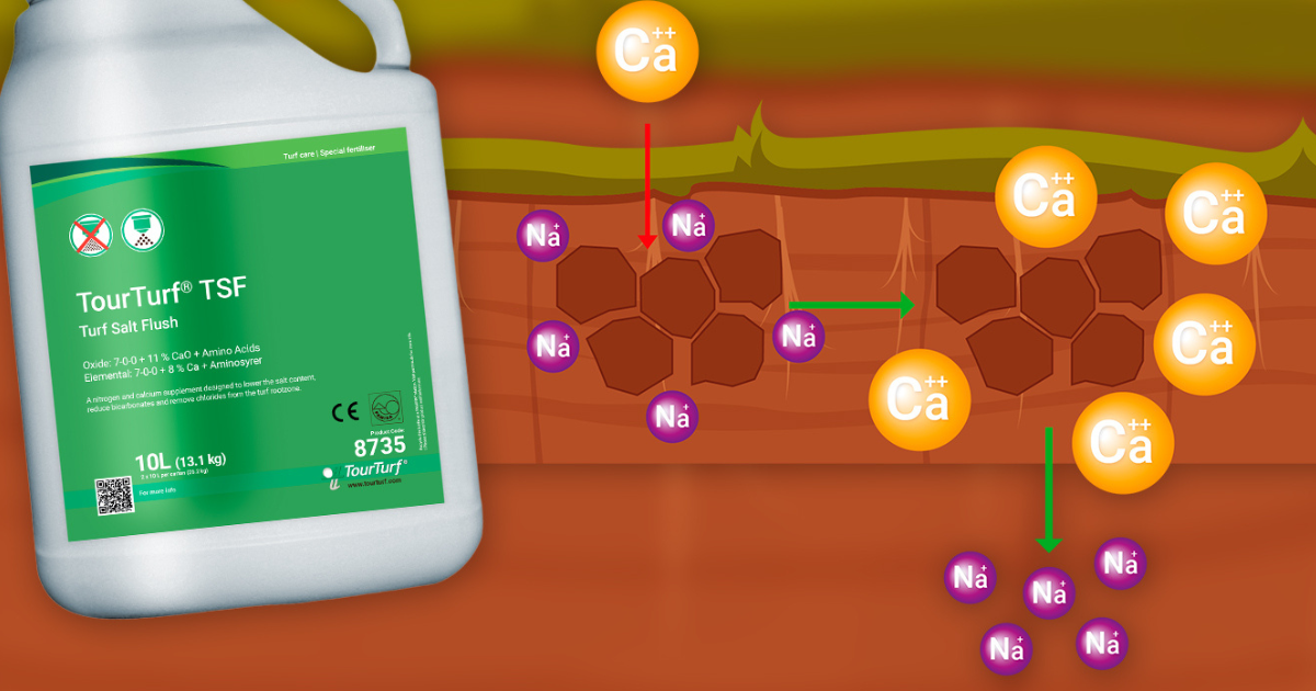 TourTurf® TSF Turf Salt Flush is a calcium and biostimulant supplement designed to lower the salt content, reduce existing bicarbonates and remove chlorides from the rootzone. It is designed to both reduce and balance the salinity of the turf rootzone, meaning plants can easily absorb water with a reduced risk of salt stress.