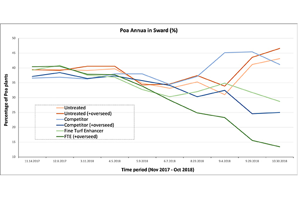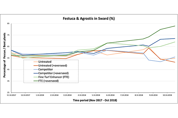 Over a full season of use, our data suggests a 16% increase in the Agrostis / Festuca component of the sward, compared to an 8.2% decrease in untreated plots without overseeding. Agrostis / Festuca composition increased by 61% with overseeding.