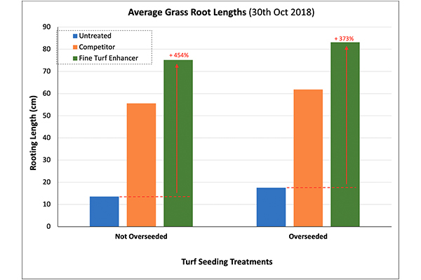 Overall germination of Agrostis seed was increased by 17% compared to when untreated, which was shown in lab studies. Overseeding success will also be increased by the improved water distribution in the soil.